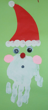Use green paper. Paint fingers white for beard. Paint palm skin color (mix a little orange